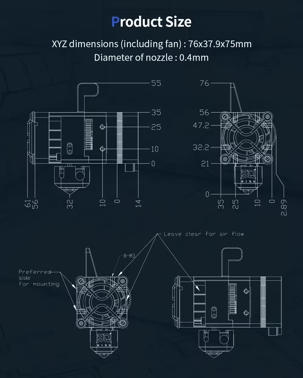 Ekstruder wyróżnia się lekką konstrukcją, ważąc zaledwie 222 g. Dzięki temu zmniejsza bezwładność ruchu głowicy, co przekłada się na większą dokładność i jakość wydruków. Kompaktowa budowa pozwala na łatwą instalację w wielu popularnych drukarkach 3D.