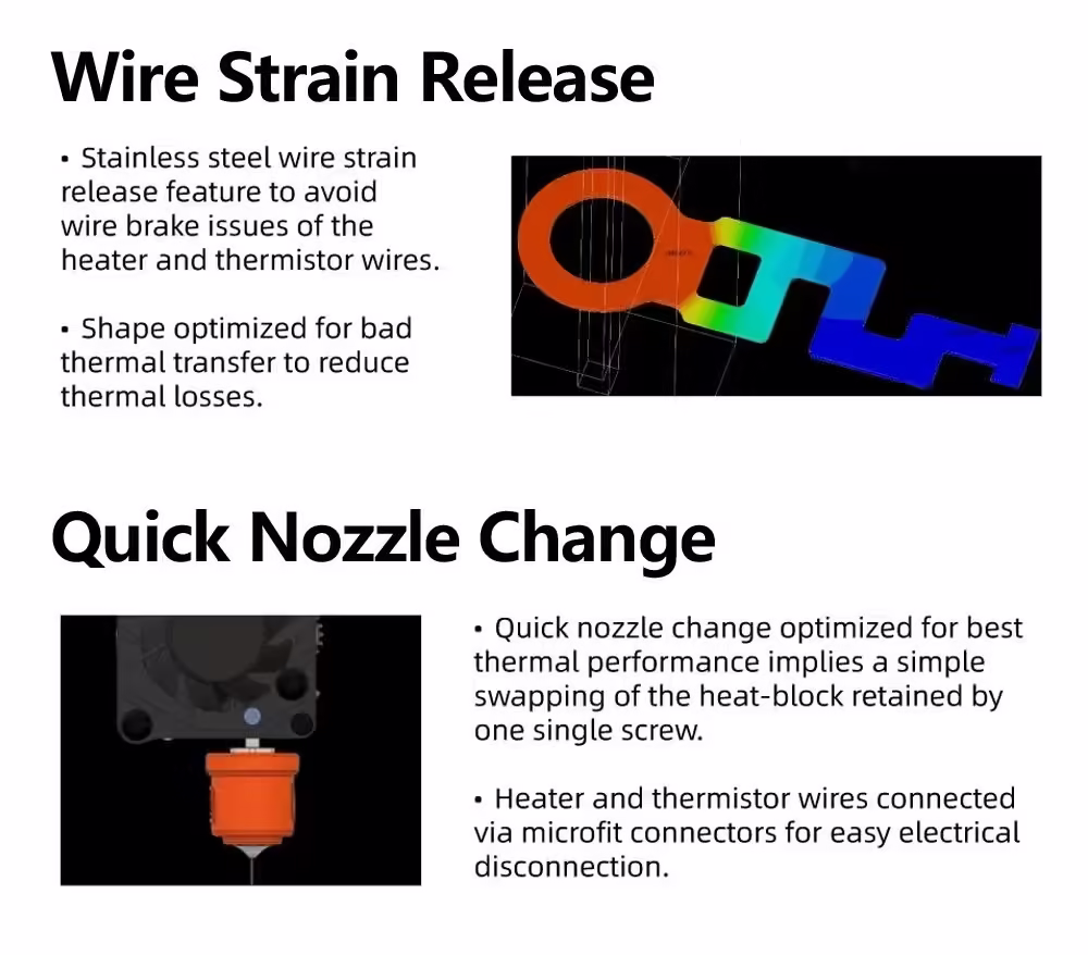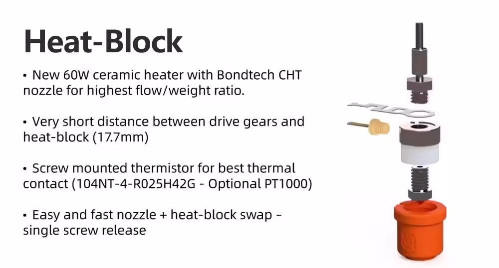 Zaawansowany system napędu z przekładnią planetarną i powłoką RNC zapewnia doskonałą siłę ekstruzji oraz niezrównaną precyzję, umożliwiając stabilną i wydajną pracę przy wysokich prędkościach. Bi-Metal Heatbreak z ekstremalnym gradientem temperatur gwarantuje efektywne zarządzanie ciepłem, eliminując ryzyko zatorów i zapewniając niezawodność w druku z materiałami wymagającymi wysokiej temperatury.
