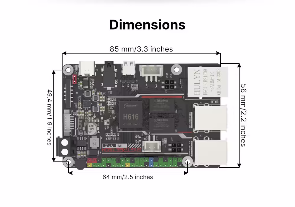 Dzięki kompaktowym wymiarom odpowiadającym standardowi Raspberry Pi, BTT Pi V1.2 stanowi idealne rozwiązanie dla użytkowników poszukujących wydajnego i wszechstronnego mikrokomputera do zastosowań w druku 3D oraz innych projektach wymagających niezawodnej i elastycznej platformy sprzętowej.