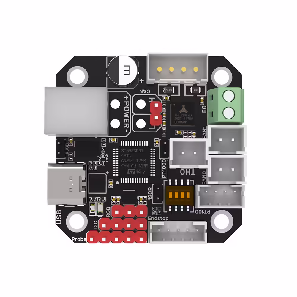 BIGTREETECH EBB42 V1.2 to nowoczesna płytka adaptera dyszy, przeznaczona dla ekstruderów z silnikami krokowymi typu 42. Podobnie jak model EBB36, oferuje komunikację poprzez interfejs USB lub CAN, co upraszcza instalację i redukuje ilość okablowania. Wyposażona w sterownik TMC2209, zapewnia płynną i cichą pracę silnika ekstrudera. Na płytce znajduje się również akcelerometr ADXL345 do monitorowania ruchu oraz układ MAX31865, umożliwiający precyzyjny pomiar temperatury za pomocą czujników PT100/PT1000. Aktualizacje firmware są możliwe przez interfejsy SWD lub DFU, co zapewnia łatwe utrzymanie urządzenia w aktualnym stanie. Płytka jest w pełni kompatybilna z oprogramowaniem Klipper, co czyni ją idealnym wyborem dla zaawansowanych użytkowników drukarek 3D.
