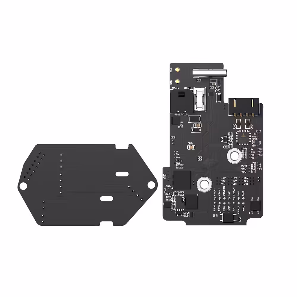 Sercem modułu jest wydajny mikrokontroler STM32G0B1CBT6 o częstotliwości 64 MHz, który zapewnia niezawodną komunikację i szybkie przetwarzanie danych. Wbudowany sterownik TMC2209 umożliwia precyzyjne sterowanie silnikiem krokowym, co przekłada się na wysoką jakość wydruków oraz cichą i płynną pracę. Moduł obsługuje czujniki temperatury PT100 i PT1000, co pozwala na dokładne monitorowanie temperatury głowicy drukującej. Dodatkowo, płyta została wyposażona w dwa 2-pinowe oraz jedno 4-pinowe złącze dla wentylatorów, z możliwością wyboru napięcia zasilania 5V, 12V lub 24V, co zapewnia elastyczność w doborze akcesoriów chłodzących.
