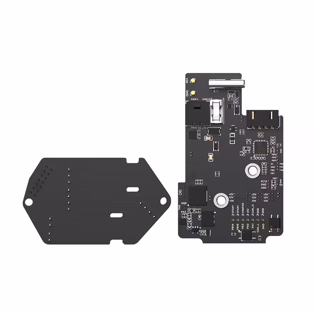 Sercem modułu jest mikrokontroler STM32G0B1CBT6 o częstotliwości 64 MHz, który zapewnia niezawodną komunikację oraz szybkie przetwarzanie danych. Wbudowany sterownik TMC2240 umożliwia precyzyjne sterowanie silnikiem krokowym, co przekłada się na wysoką jakość wydruków oraz cichą i płynna pracę. Moduł obsługuje czujniki temperatury PT100 i PT1000, co pozwala na dokładne monitorowanie temperatury głowicy drukującej. Dodatkowo, płyta została wyposażona w dwa 2-pinowe oraz jedno 4-pinowe złącze dla wentylatorów, z możliwością wyboru napięcia zasilania 5V, 12V lub 24V, co zapewnia elastyczność w doborze akcesoriów chłodzących.