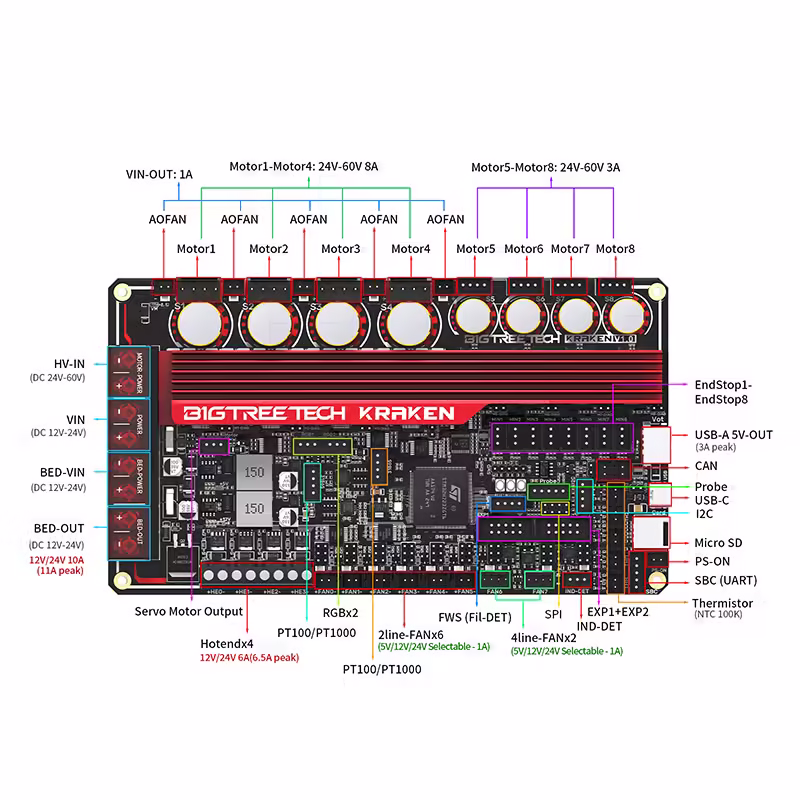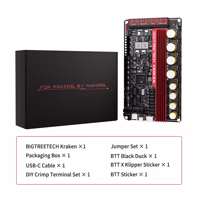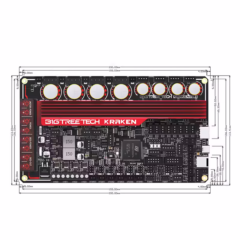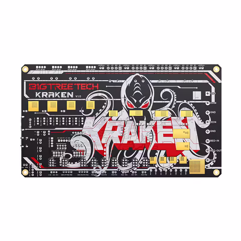 BIGTREETECH Kraken V1.0 to zaawansowana 32-bitowa płyta główna stworzona z myślą o dużych drukarkach 3D. Dzięki zintegrowanym sterownikom silników krokowych o wysokim napięciu i natężeniu (24V-60V), umożliwia łatwe podłączenie do silników o dużej mocy, co upraszcza konstrukcję obudowy i zwiększa wydajność urządzenia.