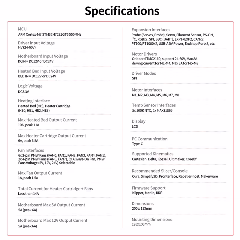 Sercem płyty jest mikroprocesor STM32H723ZGT6 z rdzeniem ARM Cortex-M7 o częstotliwości 550 MHz, zapewniający szybkie i płynne przetwarzanie poleceń. Kompatybilność z oprogramowaniem Marlin, Klipper i RRF pozwala na elastyczne dostosowanie do różnych potrzeb użytkowników.