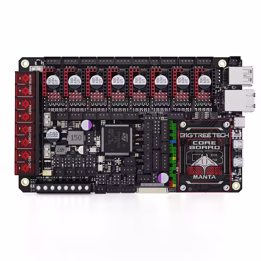 BIGTREETECH Manta M8P V2.0 to zaawansowana 32-bitowa płyta główna zaprojektowana z myślą o entuzjastach druku 3D, oferująca szerokie możliwości rozbudowy i integracji z różnorodnymi modułami. Wyposażona w procesor ARM® Cortex-M7 STM32H723ZET6 o taktowaniu 550 MHz, zapewnia wyjątkową wydajność i stabilność podczas pracy.